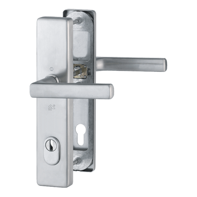 Roestvaststalen inbraakwerend langschild-krukgarnituur met cilindertrekbeveiliging voor buitendeuren.