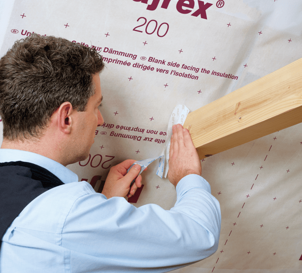 Voor het aansluiten van luchtafdichtlagen in binnentoepassingen is de symmetrisch voorgeplooide, sterk klevende tape bijzonder voor het aansluiten op balken en dakvensters geschikt.